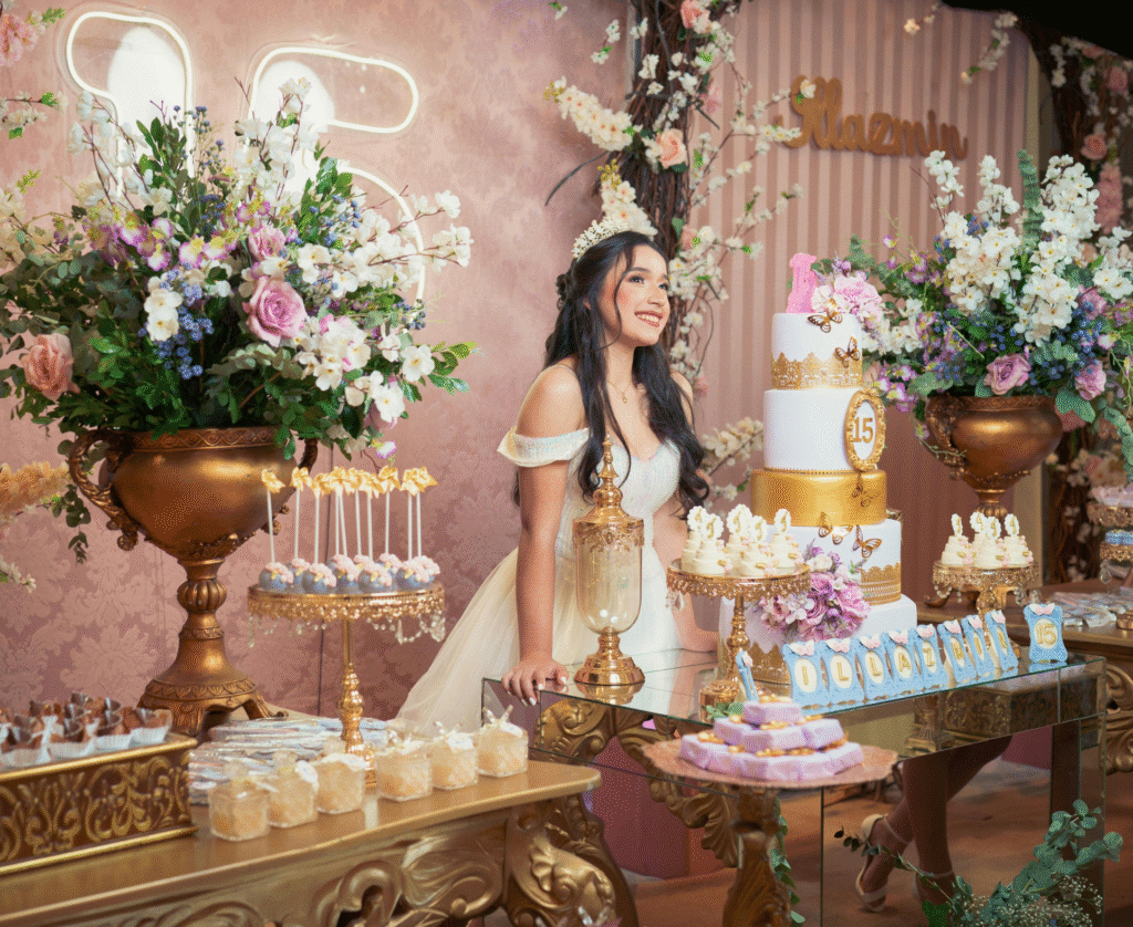 We plan the backdrop, cake space, seating and photo area.